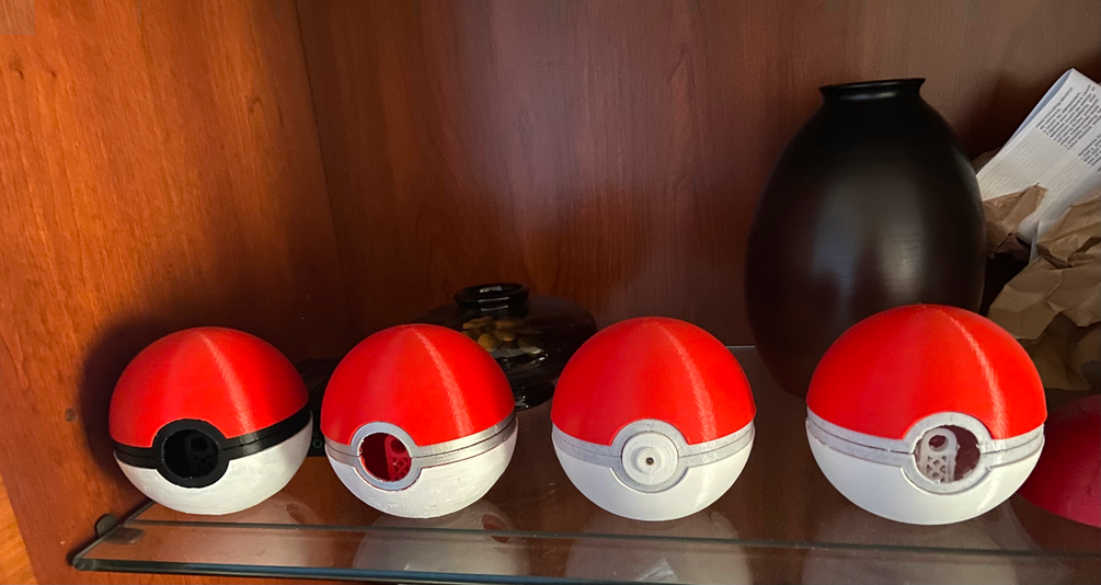 This is a project that I made a to make a laser pointer and button case that looks like a pokeball. It uses 3 small (5mm) cube magnets, 1 push button, 1 3v coin cell battery, 1 laser diode, and some wire and electrical tape to assemble. The shells are divided by color for their names: Red being the top shell, White being the Bottom Shell, grey being the middle section that uses a raft and a print-in-place hinge and also locks into the red & white shells. The piece that holds the front half of the laser diode is called the laser cap and the piece that holds the back half is called the center piece. The piece that caps the pushbutton is the button cap. To assemble, solder two wires to two leads of the pushbutton, glue the push button into its socket in the bottom shell, and glue the button cap to the push button. Then press the laser diode into its front shell and then back shell and then insert into axis hole in the bottom shell. Then solder the power wire to the push button and bring a separate wire from the push button to press against the positive side of a coin battery. Make sure the ground wire is pressed up against the negative side of the coin battery and tape it all together using electrical tape.